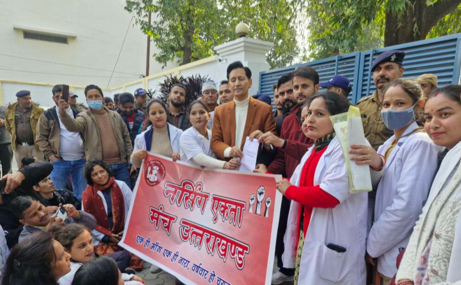 हल्द्वानी। उत्तराखंड में नर्सिंग भर्ती वर्षवार कराने समेत अन्य लंबित मांगों को लेकर शुक्रवार को नर्सिंग एकता मंच ने बुद्धपार्क में प्रदर्शन किया। इसके बाद नर्सों ने कुमाऊं कमिश्नर दीपक रावत के आवास तक जुलूस निकालकर उन्हें ज्ञापन सौंपा। नर्सिंग एकता मंच के बैनर तले प्रदर्शन कर आंदोलनकारियों ने कहा कि वर्षवार भर्ती नहीं होने से हजारों योग्य उम्मीदवारों के साथ अन्याय हो रहा है। उन्होंने वर्तमान में जारी नर्सिंग अधिकारी भर्ती परीक्षा का पोर्टल तत्काल प्रभाव से बंद करने और नई भर्ती प्रक्रिया वर्षवार शुरू करने की मांग की। आंदोलनकारियों का दावा है कि वर्तमान भर्ती प्रक्रिया से पारदर्शिता और न्यायसंगत व्यवस्था पर सवाल खड़े हो रहे हैं। उन्होंने कहा कि इससे हजारों अभ्यर्थियों का भविष्य प्रभावित हो सकता है। ‘2500 रिक्त पदों पर निकाली जाए भर्ती’ आंदोलनकारियों ने ज्ञापन में इंडियन पब्लिक हेल्थ स्टैंडर्ड्स (IPHS) के मानकों के आधार पर करीब 2500 रिक्त पदों पर शिक्षा स्वास्थ्य विभाग और चिकित्सा स्वास्थ्य विभाग में एक साथ भर्ती निकालने की मांग भी रखी है। इसके साथ ही निर्धारित आयु सीमा पार कर चुके अभ्यर्थियों को इस भर्ती में विशेष छूट देने की भी मांग की गई है। उन्होंने मामले में ठोस कार्रवाई नहीं होने पर आंदोलन की चेतावनी दी है। Post navigation सीएम धामी ने दी बागेश्वर जिले की तीन सड़कों के नाम बदलने की स्वीकृति हरदा से मिले सीएम धामी, दिया ऐसा गिफ्ट जिसने बटोरी सुर्खियां