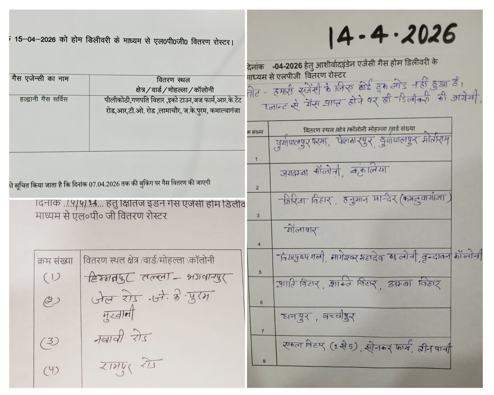 हल्द्वानी। शहर में इंडेन गैस की अलग-अलग एजेंसियों ने LPG सिलिंडर बांटने के लिए अलग-अलग रोस्टर जारी किए हैं। 14 अप्रैल के लिए जारी इन रोस्टरों में काठगोदाम व हल्द्वानी समेत आसपास के इलाकों में LPG सिलिंडर बांटे जाने की जानकारी दी गई है।